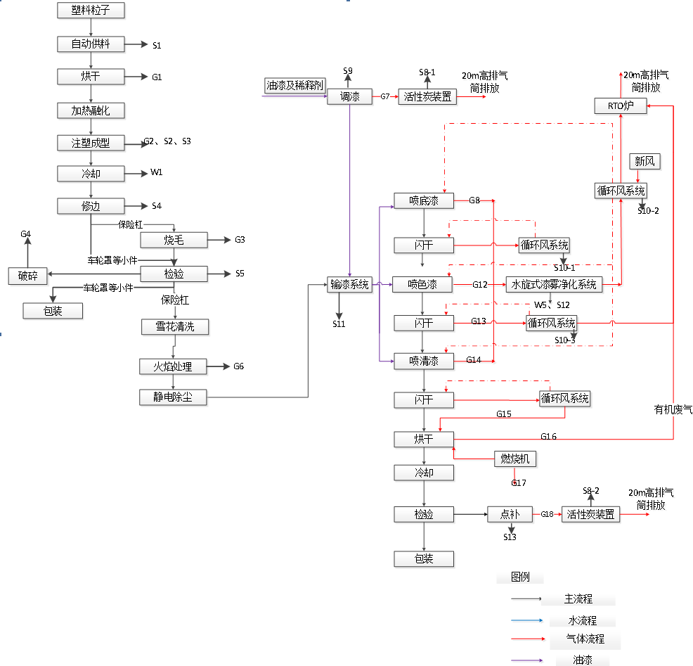 新建有汽車、摩托車配件噴涂生產(chǎn)流水線1套(年產(chǎn)汽車配件60萬(wàn)臺(tái)、摩托車配件50萬(wàn)臺(tái));汽車配件裝配線1套(年產(chǎn)汽車內(nèi)飾件等70萬(wàn)套);大型注塑機(jī)30余臺(tái)(年生產(chǎn)摩托車覆蓋件白坯、汽車內(nèi)飾前后保險(xiǎn)杠和白坯上百萬(wàn)套)。